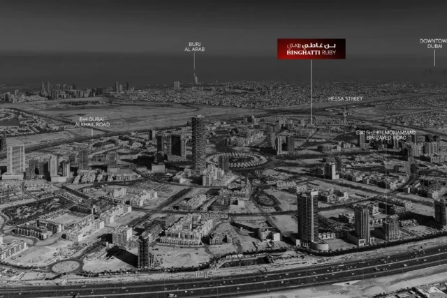 Binghatti Ruby at JVC is the latest residential addition, developed by the Binghatti Developers, featuring luxury studios, 1, 2 and 3-bedroom apartments laced with modern facilities. The elegant high-rise façade is lined with basement, ground, four leisure podium levels and two office floors as well as 18 residential luxuries along with the rooftop leisure, inspired by the opulent ruby gemstone that showcases elegance and innovation in the heart of Dubai. The building’s architecture stands out, with its avant-garde design reflecting the signature style. Each residence is crafted to offer an unparalleled living experience with high-quality finishes and modern interiors. With stunning views of the city skyline, the façade provides a luxurious urban lifestyle for residents seeking both comfort and sophistication.