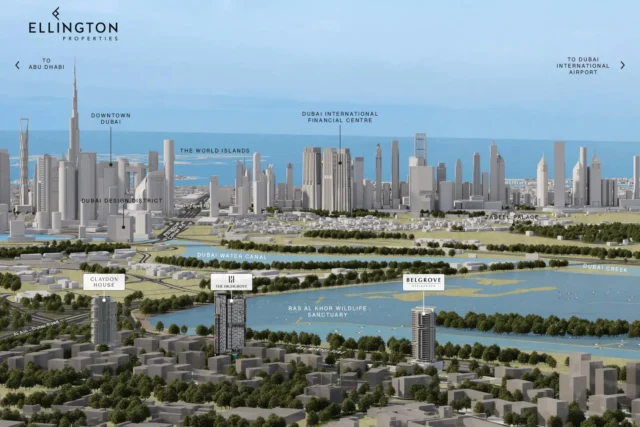 The Highgrove at MBR City is a lush oasis of contemporary waterfront living by Ellington Properties defined with premium collection of 1, 2 & 3-bedroom apartments, duplexes, sky villas and penthouses in Dubai. A new benchmark for elegance and luxury, the high-rise 35-storey façade promises an exceptional lifestyle, where verdant landscapes meet the vibrant waterfront. Architecturally stunning, this exclusive residential offering blends modern design with serene surroundings. Expansive balconies, sleek facades, and floor-to-ceiling windows offer panoramic views of Dubai’s iconic skyline and tranquil waters, all while maximizing natural light and airflow. Experience the pinnacle of refined living in a community designed for luxury.